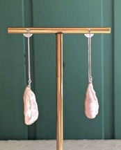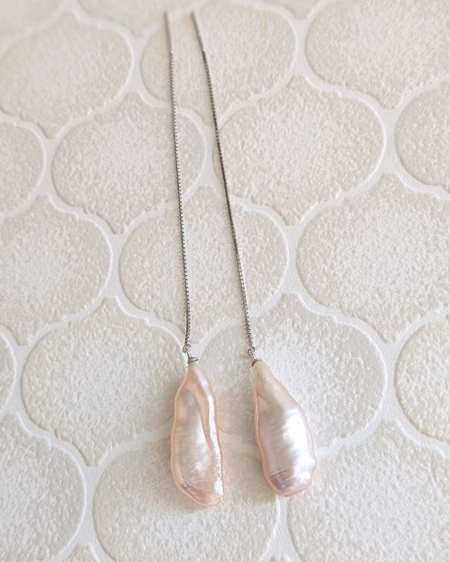しずくのように細長い淡水真珠をあしらったチェーンピアス。