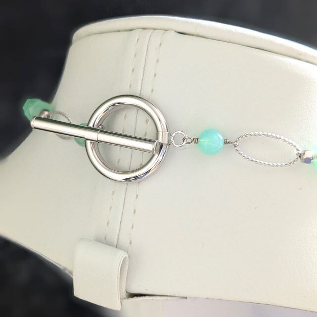 K14WGの留め金であるマンテル(トグル&バー)にはクリソプレーズのころんとした